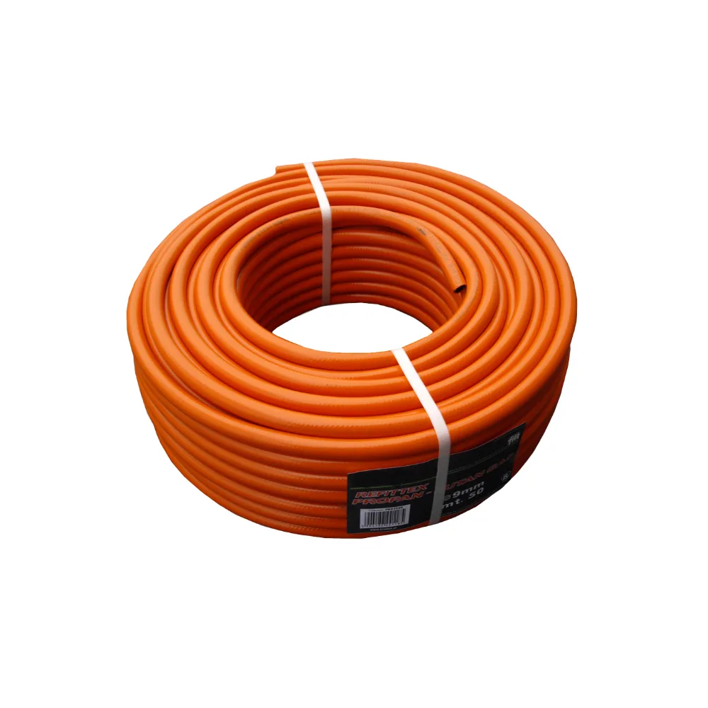 Gas hose with tear-resistant polyester reinforcement. For propane-butane, mainly for connecting gas cylinders with gas receivers. Made of special PVC components and various types of rubber.