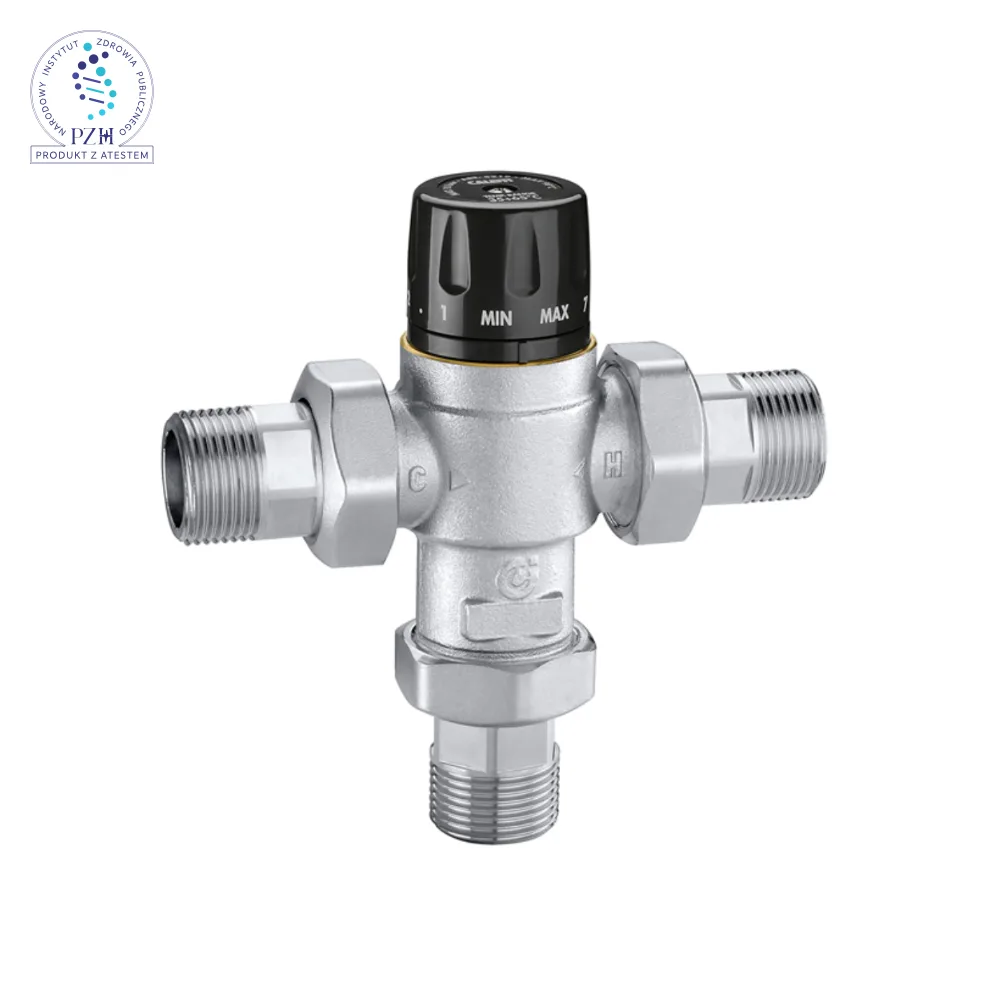 The valves maintain a constant, set temperature of the mixed water, regardless of the temperature and pressure of cold and hot water at the inlet. The valves have an automatic thermal cut-off function in the event of a lack of cold water supply. Body: chrome-plated brass resistant to dezincification CR CW 602N, closing element: PSU, spring: stainless steel, seals: EPDM, knob: ABS.