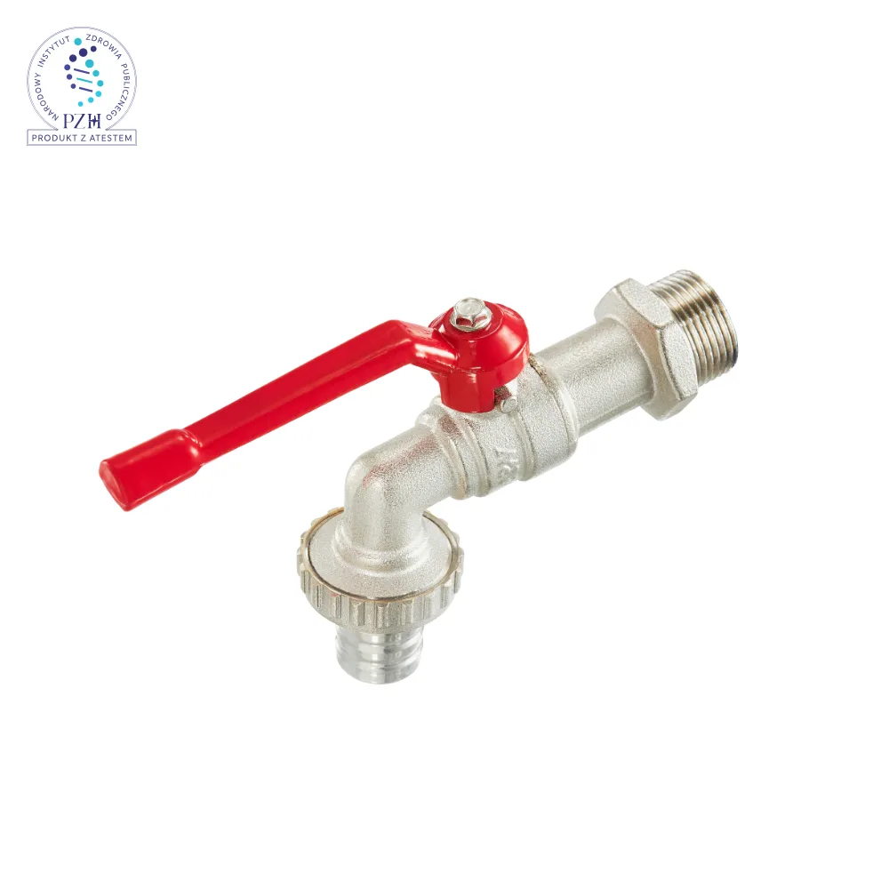Ball bibcock valve, reduced passage – for water and heating installations. Body: CW 617N nickel-plated brass, ball: CW 617N chrome-plated brass, spindle: CW 617N brass, ball seals: PTFE, spindle seals: NBR rubber, control lever: galvanized and plastic-coated carbon steel.