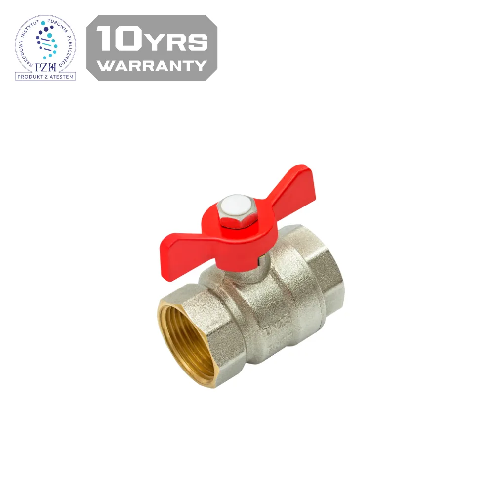 Standard passage ball valve – for water and heating installations. Body: nickel-plated brass, ball: chrome-plated brass, spindle: brass, seals: PTFE, NBR, butterfly: paint coated aluminium.