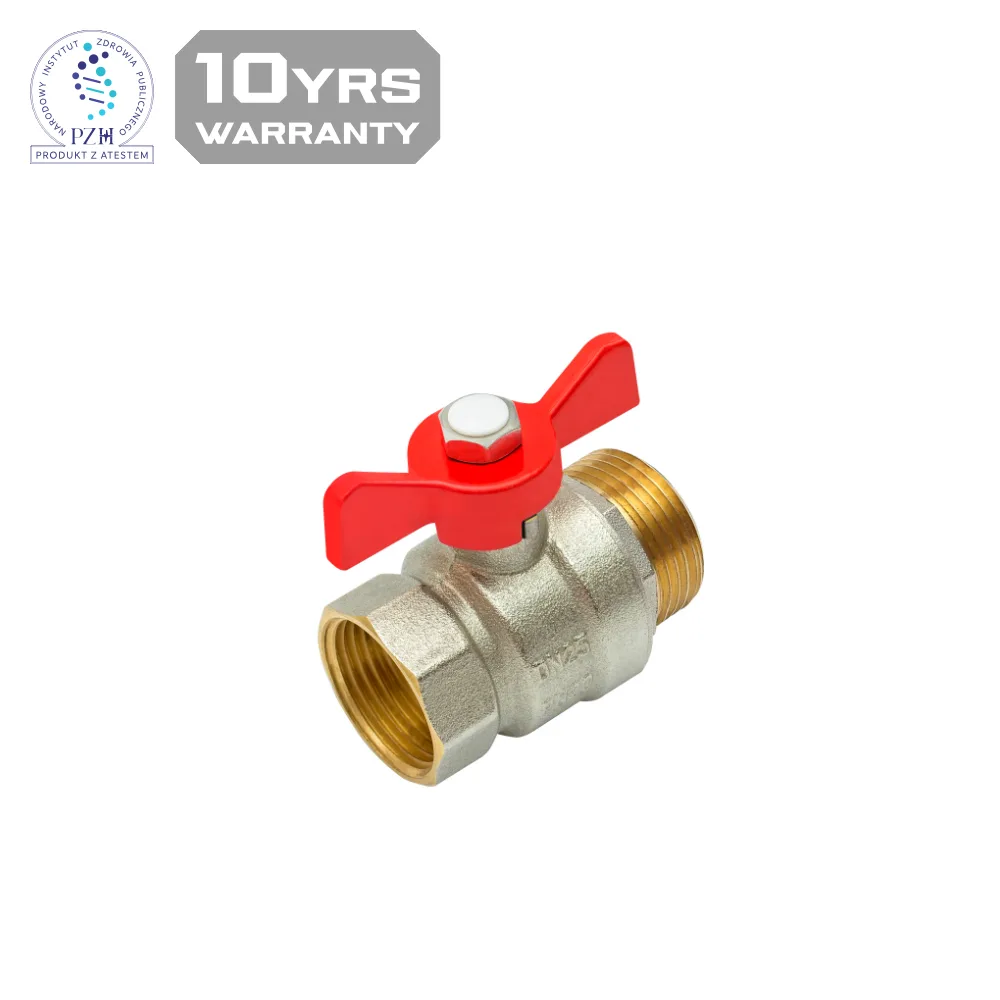 Ball valve for water, heating, cooling and compressed air installations. Body: nickel-plated brass, ball: chrome-plated brass, spindle: brass, seals: PTFE, NBR, control butterfly lever: painted aluminium.