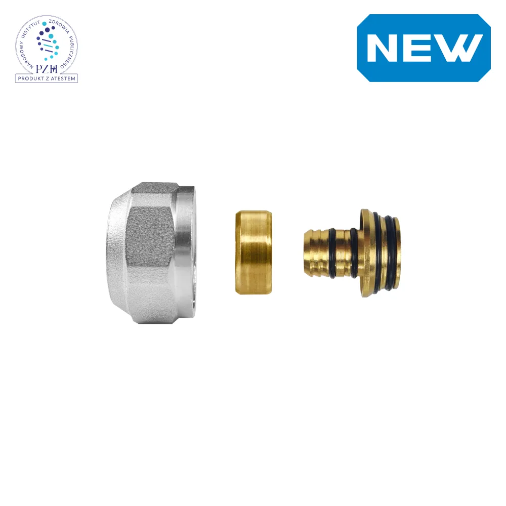Compression adapter with F threaded Eurocono end for multilayer pipes. The adapter has four O-rings and a hexagonal nut that makes it easy to tighten with a wrench. Body, nut and clamping ring: brass.