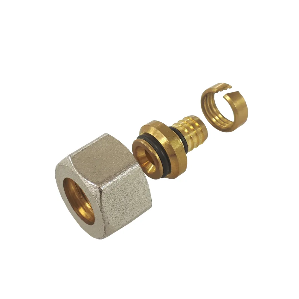 Compression adapter for PEX/AL/PEX pipes suitable for manifolds and wall connectors of the Aquabox system. Body: CW 617N brass, seal: NBR.