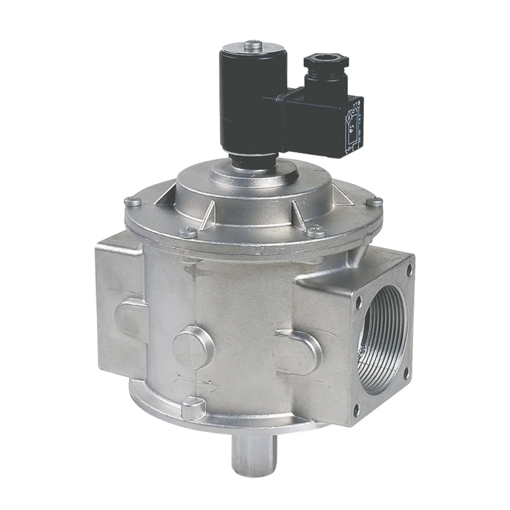 Diaphragm valve for gas – normally closed (opening occurs as a result of applying voltage to the coil). Body, cover: aluminum. Equipped with manual reset.