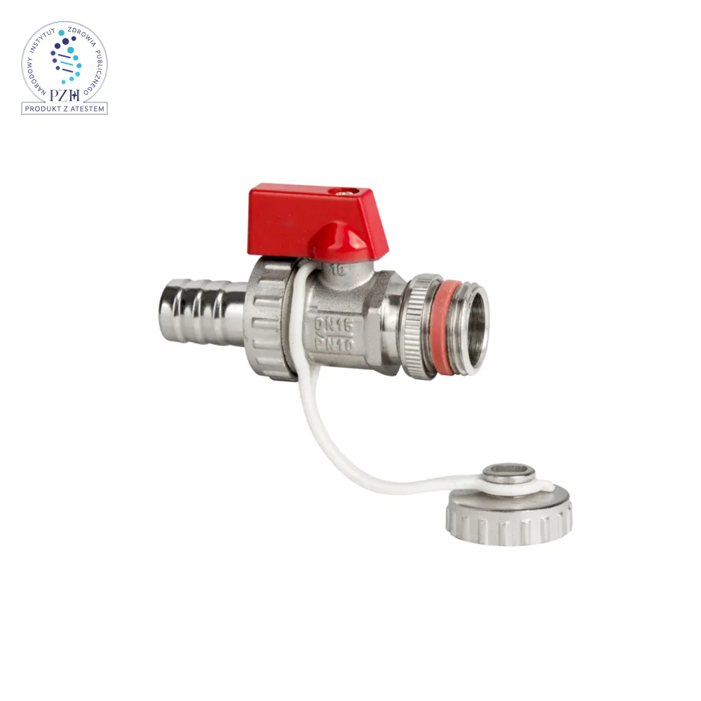 Drain cock, reduced passage, for water and heating installations. Body and spindle: CW 617N brass, ball: CW 617N chrome-plated brass, ball seals: PTFE, spindle seals: NBR, control lever: plastic.