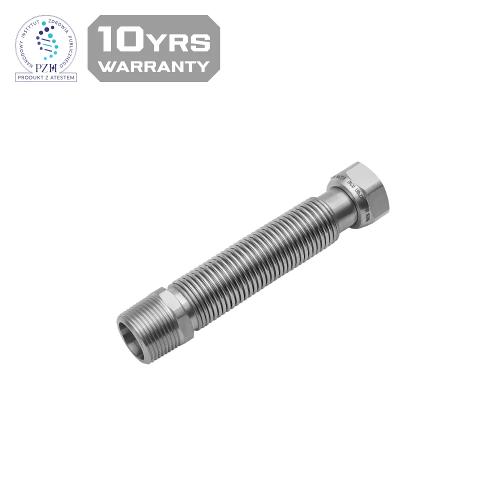 Flexible and extensible water connection hose is an alternative to rigid connections. Applications: sanitary installations, radiator connections, water connections for boilers and water heaters, water tanks and reservoirs, etc. Hose: AISI304L stainless steel, ends M threaded – AISI304 stainless steel, ends F threaded with sviwel nut – brass, gasket: fiber.