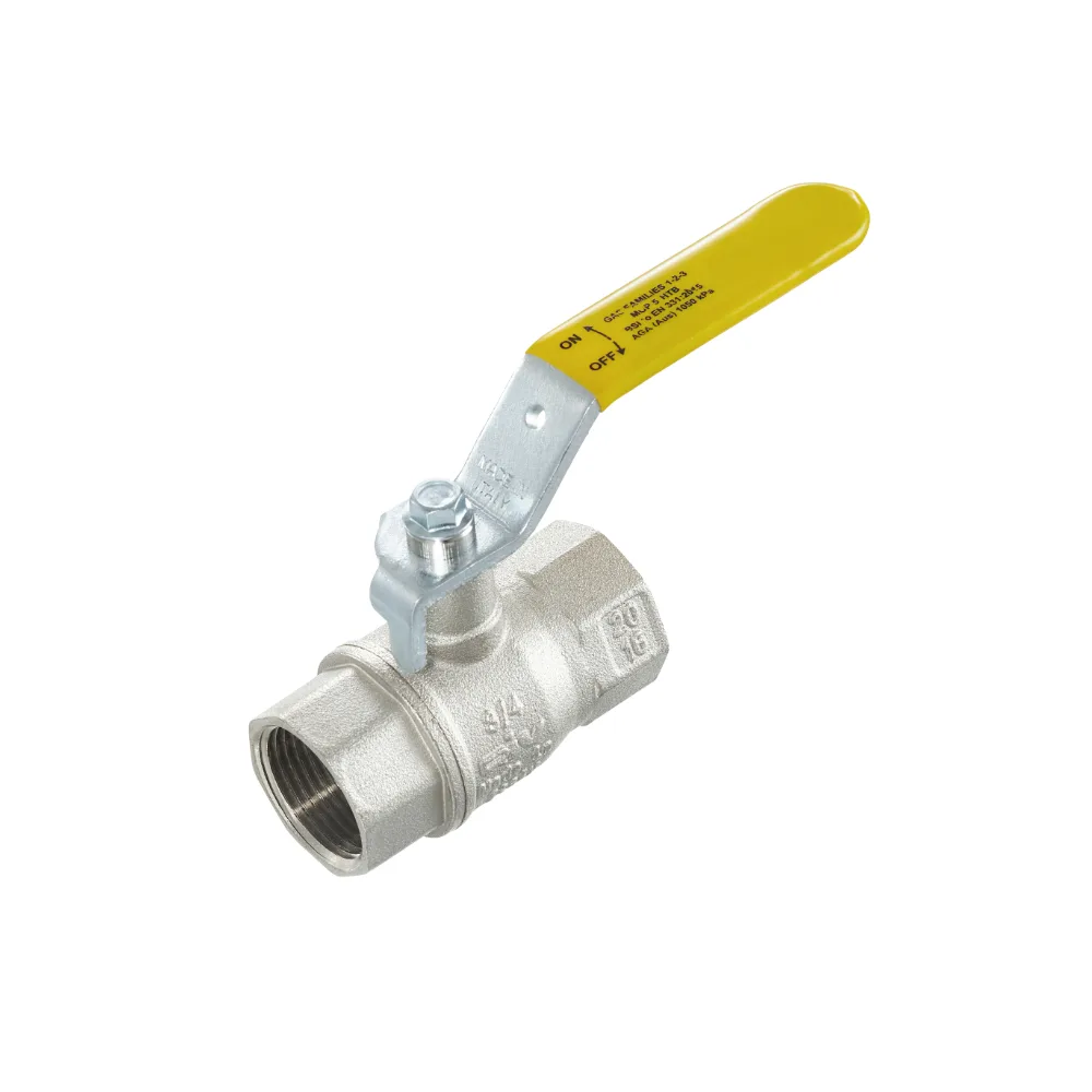 It is used to close and open the gas flow. Suitable and certified for natural gas installations in domestic and industrial networks. Body: nickel-plated brass CW 617N, ball: chrome-plated brass CW 617N, spindle: brass CW 617N, ball seals: PTFE, spindle seals: NBR, control lever: galvanized and plastic-coated carbon steel.