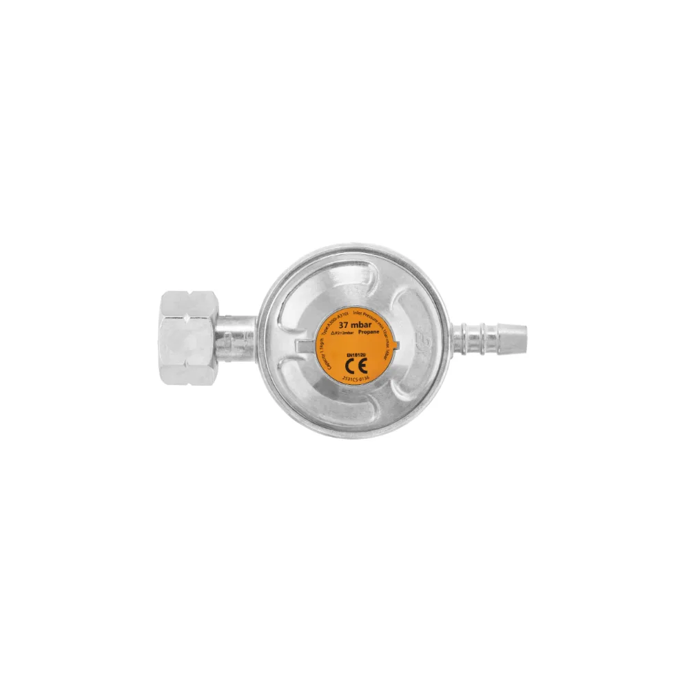 Gas pressure reducer, intended for home use, for gas powered devices from liquefied gas cylinders. The reducer can be used for cylinders with a capacity of up to 11 kg, equipped with a valve with manual opening and a 21.8 x 1.14 L connection.