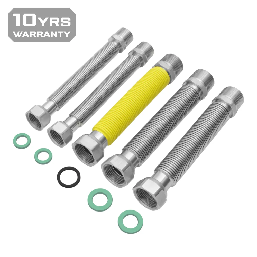 The installation kit consists of 5 flexible and extensible hoses: 1x gas connection (3/4″) and 4x water connections (two with a diameter of 1/2″ and two with a diameter of 3/4″). The hoses constitute a set needed for connection combi boiler and enable connections with a length between 150-300 mm. The set is equipped with appropriate seals for water and gas.
