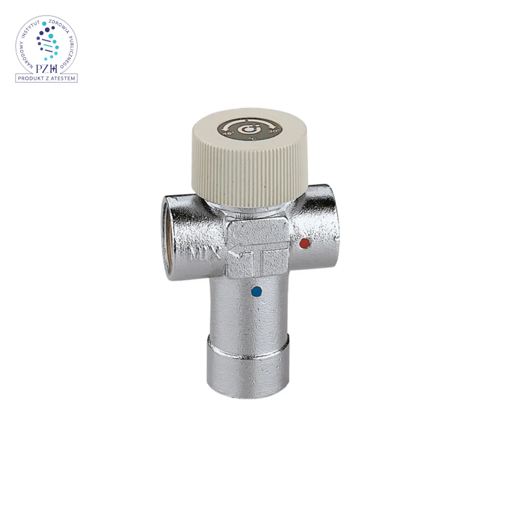 The valves maintain a constant, set temperature of mixed water, regardless of changes in the temperature coming out from the heater or tank. The valve is available in two variants of the setting range – code: 520-3048 (temperature range: +30ºC ÷ +48ºC) and code: 520-4060 (+40ºC ÷ +60ºC). Body: chrome-plated brass CW 617N, closing element: brass CW 614N, spring: stainless steel, seals: EPDM.