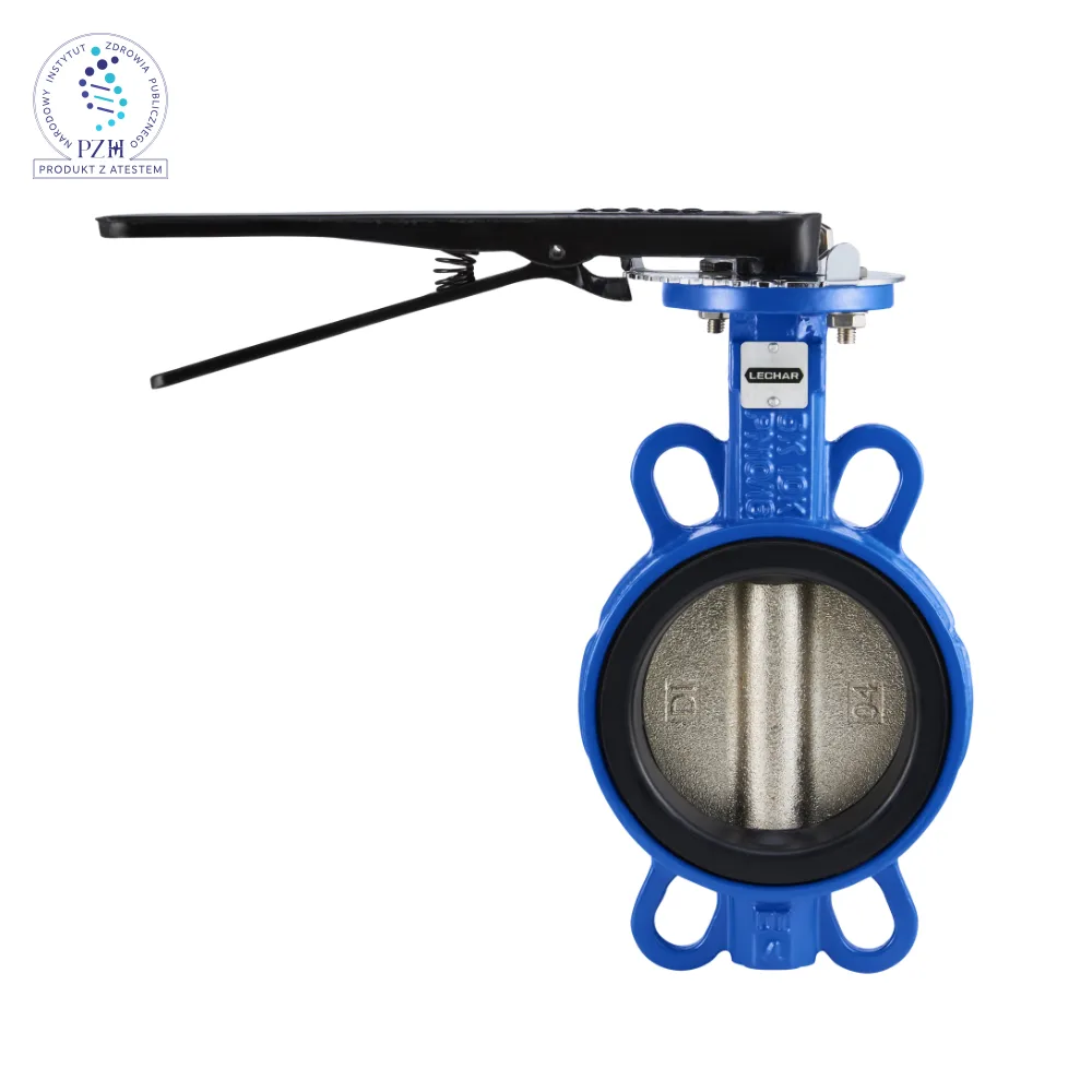 Wafer type butterfly valve for water supply, heating and industrial purposes. The valve is opened or closed by turning the lever 90 degrees. There is a latch in the handle to lock the selected position. Body and disc: ductile iron GJS-500-7, seals: EPDM, spindle: 1.4005 stainless steel.
