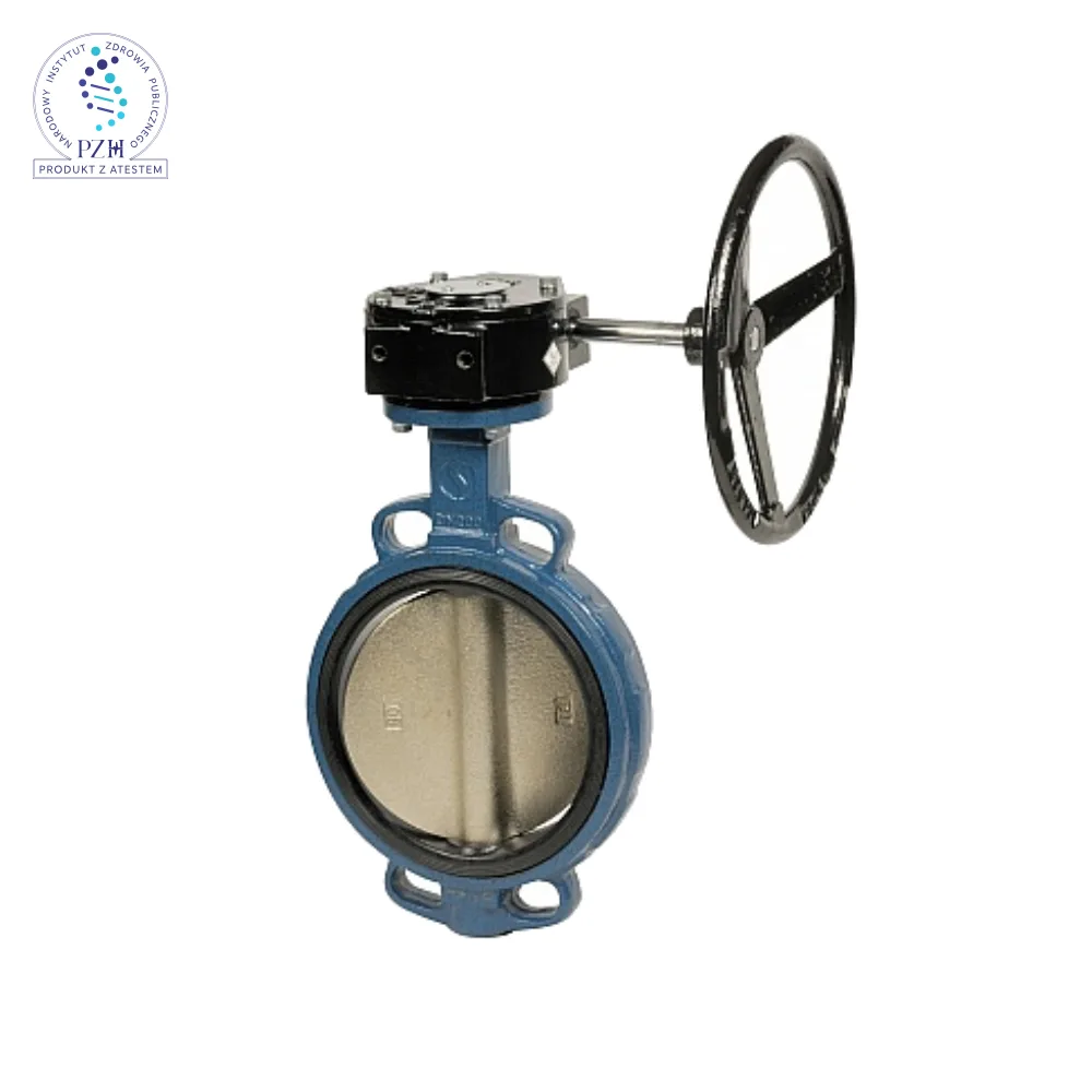 Wafer butterfly valve with manual gear box. For water, heating and industrial installations. Body: gray cast iron GJL-250 (from DN 700 body made of GJS-400 ductile iron), disc: GJS-400 ductile iron, disc seal – EPDM, spindle – AISI 420 steel (up to DN 300), AISI 431 (from DN 350).