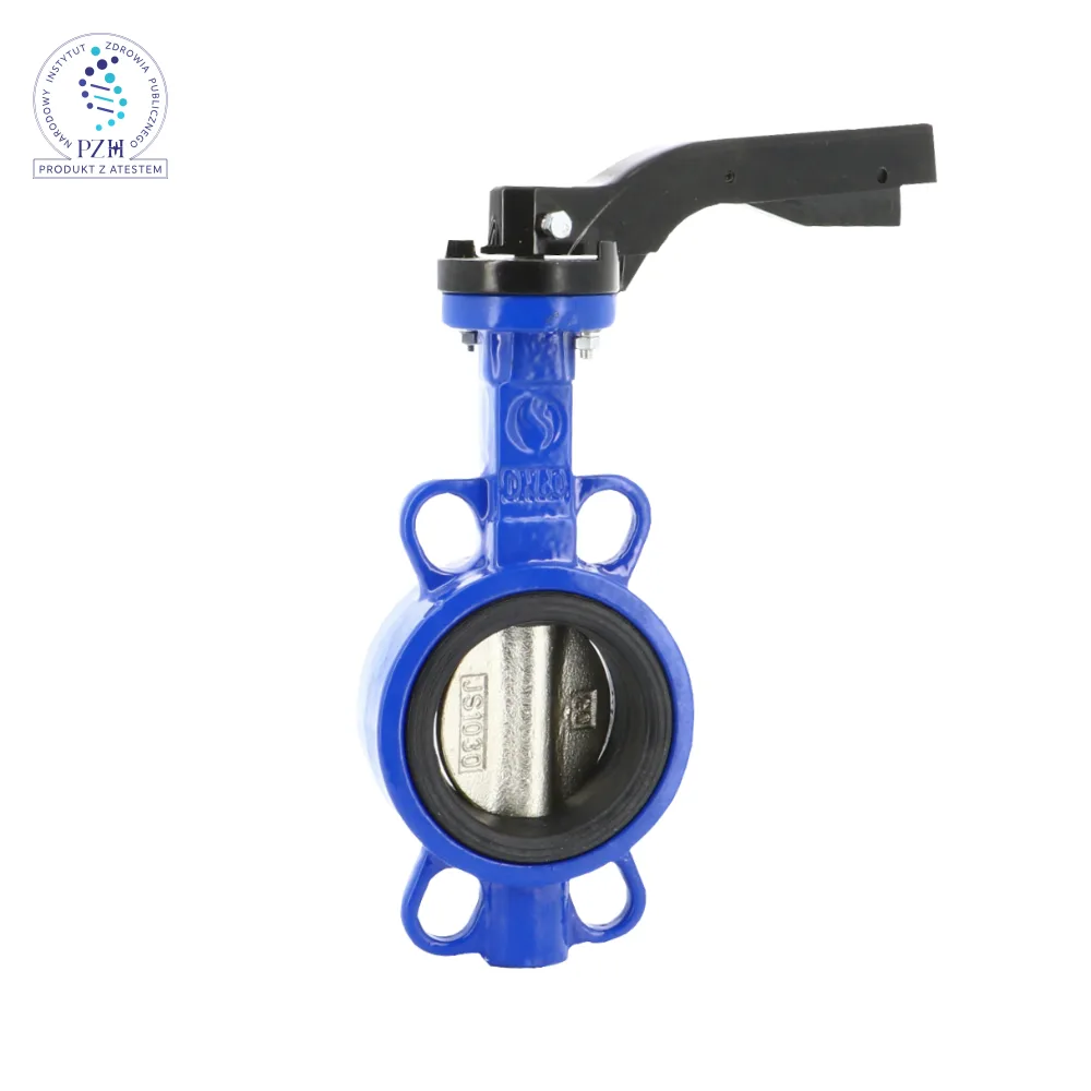 Wafer butterfly valve for water, heating and industrial installations. Body: gray cast iron GJL-250, disc: ductile iron GJS-400, disc seals: EPDM, spindle: AISI 420 steel.