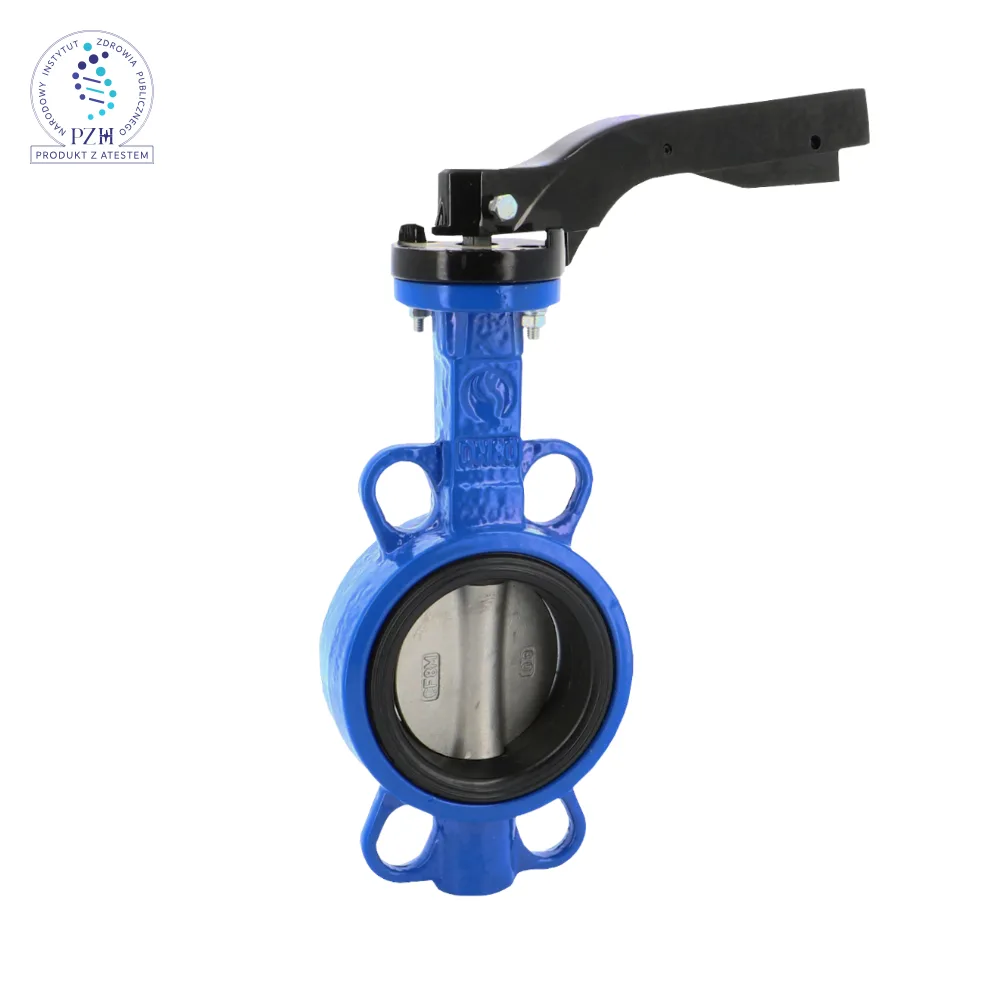 Wafer type butterfly valve for water supply, heating and industrial purposes. Body: gray cast iron GJL-250, disc: A351-CF8M steel, seals: EPDM, spindle: AISI 420 stainless steel.