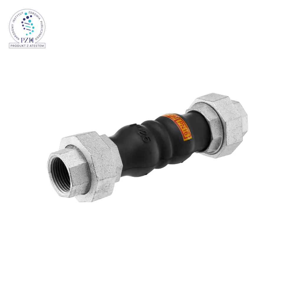 Kompensator elastomerowy do instalacji sanitarnych i grzewczych. Mieszek wykonany z EPDM z nylonową warstwą wzmacniającą, przyłącza gwintowane i nakrętki – z żeliwa ciągliwego.