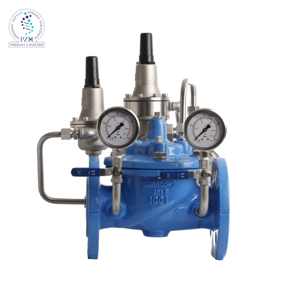 Zawór uniemożliwiający rozchód wody za zaworem, jeśli ciśnienie na wejściu, spadnie poniżej ustalonej na pilocie wartości. Stosowany np. za odgałęzieniem przeciwpożarowym – do zabezpieczenia odpowiedniego ciśnienia w rurociągu p.poż, poprzez odcięcie wody bytowej. W normalnych warunkach pracy – redukuje i stabilizuje ciśnienie wody bytowej. Korpus wykonany z żeliwa sferoidalnego GJS-400 (wariant z przyłączami kołnierzowymi) lub żeliwa szarego GJL-250 (wariant z przyłączami gwintowanymi). Dostępny w wersji z przyłączami gwintowanymi lub kołnierzowymi.