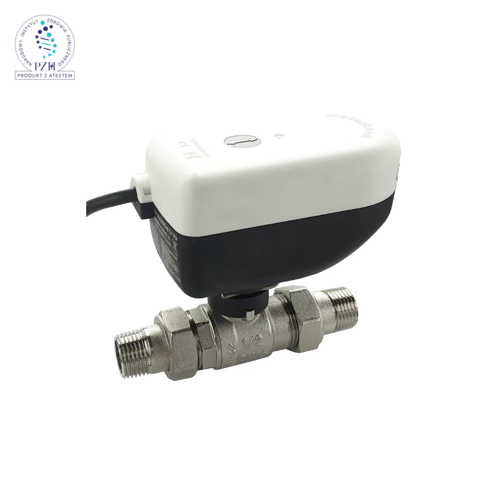 Zawór sterujący, z napędem elektrycznym, przelotowy. Służy do sterowania rozdziału czynnika roboczego. Korpus i wrzeciono zaworu wykonane zostały z mosiądzu CW617N niklowanego, kula z mosiądzu CW 617N, a uszczelnienie kuli to PTFE.