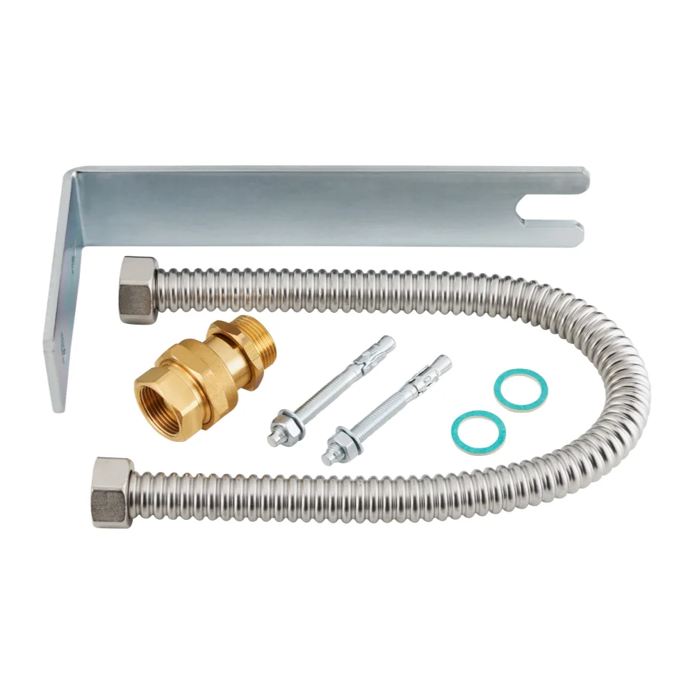 Zestaw zawiera: zawiesie naścienne, wężyk ze stalowej rury karbowanej z kompletem przyłączy, przyłącze z zaworem stopowym do zbiornika 3/4″.